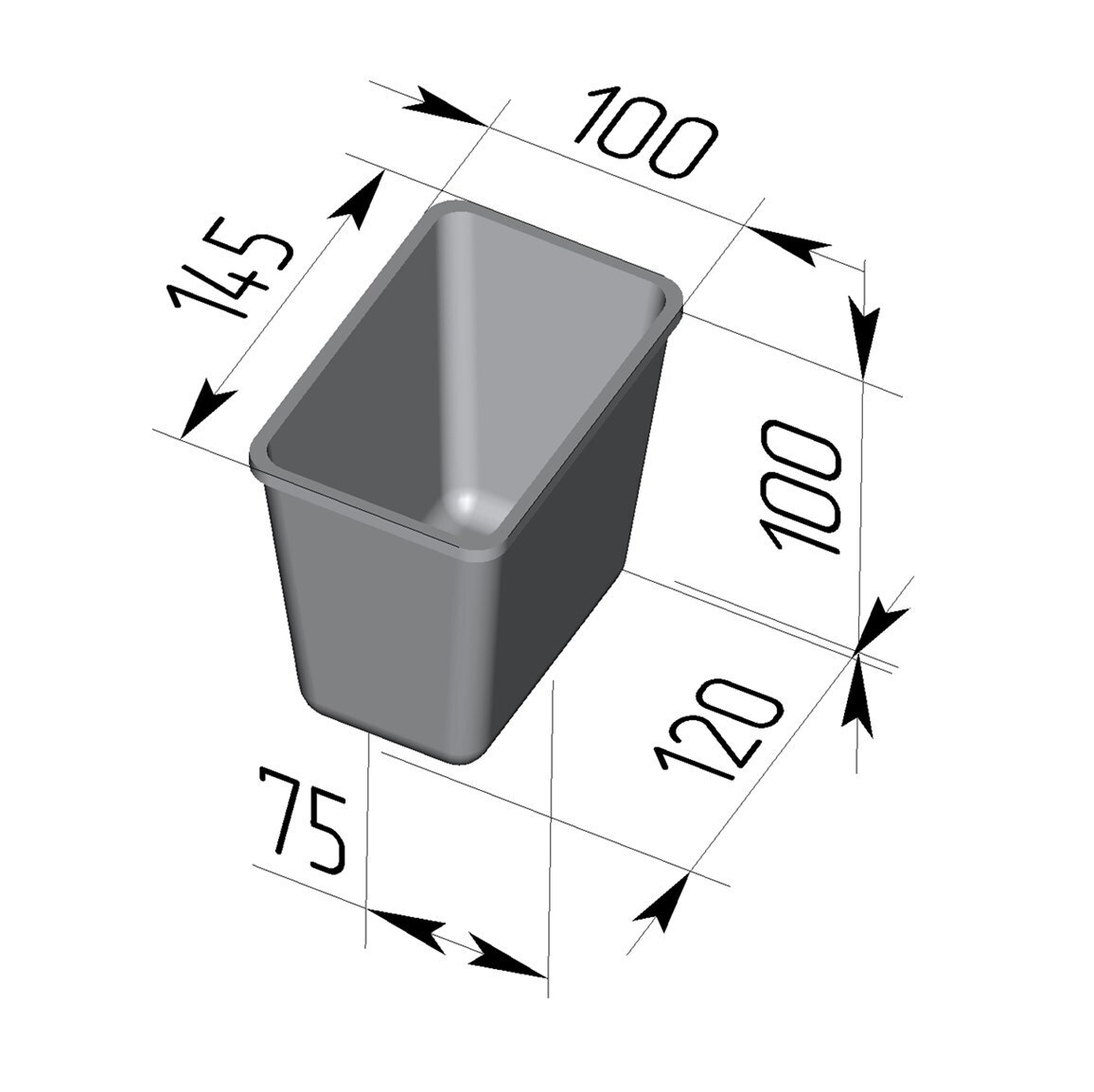Габаритные размеры формы Л11 по верху 145*100 мм, по низу 120*75 мм, высота 100 мм, объем формы 0,91 л.