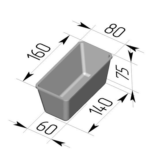 Габаритные размеры формы Л12 по верху 160*80 мм, по низу 140*60 мм, высота 75 мм, объем формы 0,59 л.