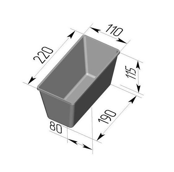 Габаритные размеры формы Л7 по верху 220*110 мм, по низу 190*80 мм, высота 115 мм, объем формы 1,82 л.