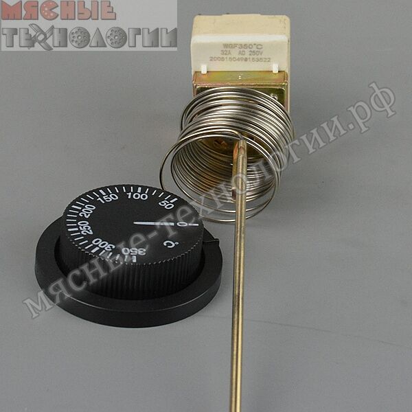 ТЕРМОРЕГУЛЯТОР WGF ДЛЯ СКОВОРОД СЭЧ.           Терморегулятор от +100°С до +350°С, длина капилляра 2,5 м, 250 В, 32 А для сковороды СЭЧ и другого технологического оборудования, используется вместо ТАМ-124. Предназначен для поддержания заданной температуры. капилляр и датчик изготовлены из нержавеющей стали. В комплект поставки входит пластиковая ручка со шкалой.           Купить кнопки, пускатели, реле, таймеры, датчики, конденсаторы, концевые выключатели, кулачковые переключатели, термопары, терморегуляторы, контроллеры, платы управления, предохранители, а также прочие комплектующие и запчасти для промышленного оборудования можно в интернет-магазине www.мясные-технологии.рф по ссылке ЗАПАСНЫЕ ЧАСТИ или обратившись к специалистам в офис компании: г. Новосибирск, ул. Дуси Ковальчук, 1, корпус 2, офис 209, ☎ 8-800-500-1324 (звонок по России бесплатный), +7 (383) 325-06-31,  infoclient@ooomt.ru.